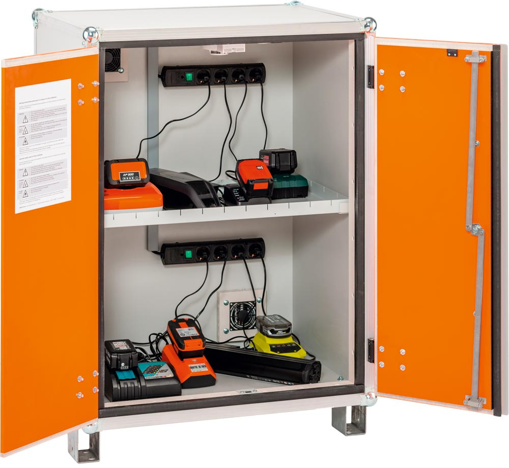 Akku-Ladeschrank, Premium Plus, strombetriebener Rauchmelder, BxTxH 800x660x1110mm, Tür orange, Stapelfüße, Korpus grau