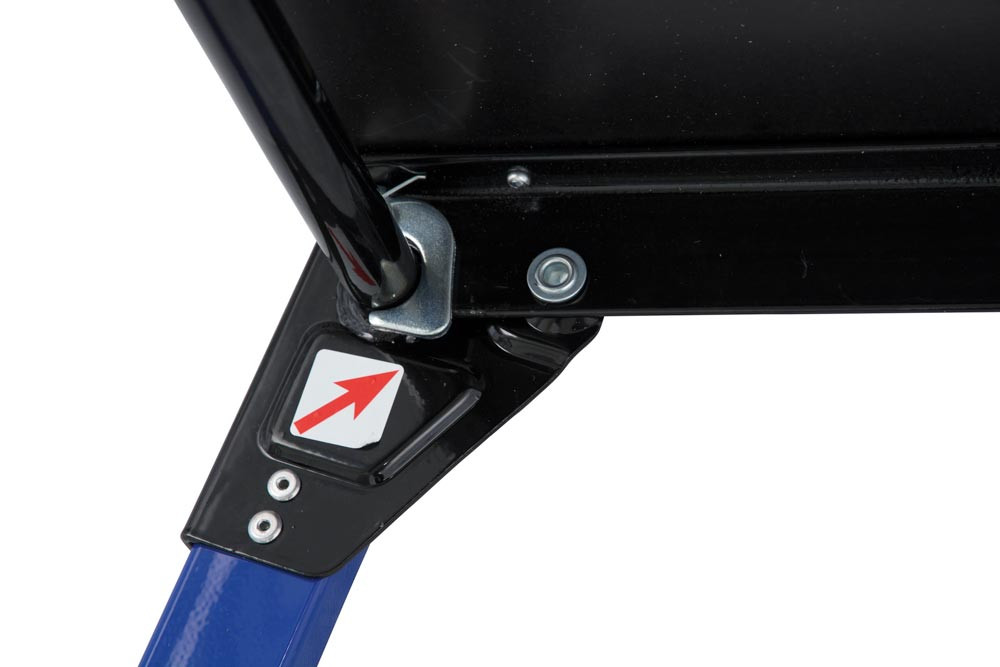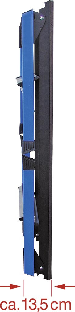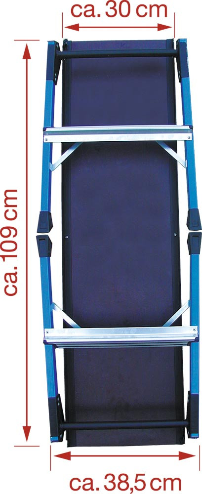 ∙ Breite, rutschsichere Fußkappen für zusätzliche Standsicherheit ∙ Alu-Holme pulverbeschichtet (blau) ∙ Rutschsichere, wasserfeste Phenolharz-Siebdruck-Platte (1090 x 300 mm) ∙ Ausgestattet mit zwei Sicherheitsverriegelungen die automatisch beim Aufklappen einrasten ∙ Platzsparend zu verstauen, handlich und leicht (ca. 8,0 kg) ∙ Platzsparend zu verstauen, handlich und leicht (ca. 8,0 kg) ∙ Profilierte, rutschfeste 80 mm tiefe Alu-Stufen für sicheren Aufstieg und bequemen Stand ∙ 4 stabile Eckverstrebungen für größere Stabilität ∙ Bis Arbeitshöhe von ca. 2,50 m