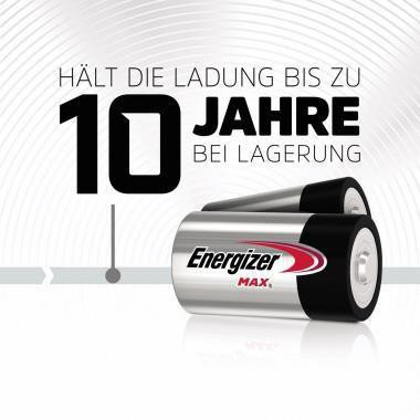 Energizer Max schützt Ihre Geräte und speichert Power auf Dauer. Premium Alkali-Batterie für zuverlässige und langlebige Leistung. Die innovative Energizer PowerSeal Technologie speichert Energie 10 Jahre lang und bietet Ihnen die Leistung · die Sie benötigen · wann immer notwendig. Energizer Max Batterien eignen sich für alle Geräte des täglichen Gebrauchs.