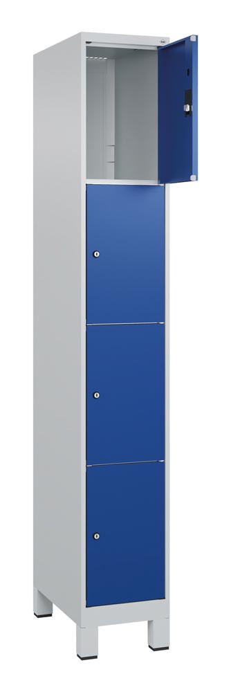 Fächerschrank, BxTxH 300x500x1950 mm, 1x4 Fächer, Abt.B 300 mm, Füße, Schloss, glatte Türen, RAL 7035/5010 E6479288