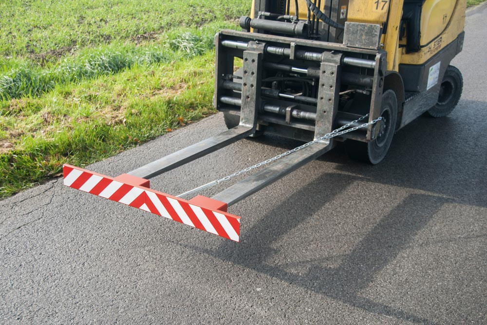 · Stabile Stahlblechkonstruktion · Mit Einfahrtaschen · Sicherung gegen Abrutschen · Standardmäßig für max. Zinkenlänge 1200 mm (bei längeren ZInken bitte deutlich vermerken)· Lackierung RAL 3000 feuerrot · Rot-weiße Warnmarkierung