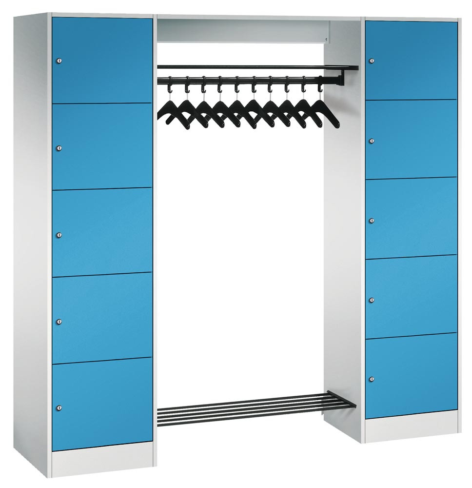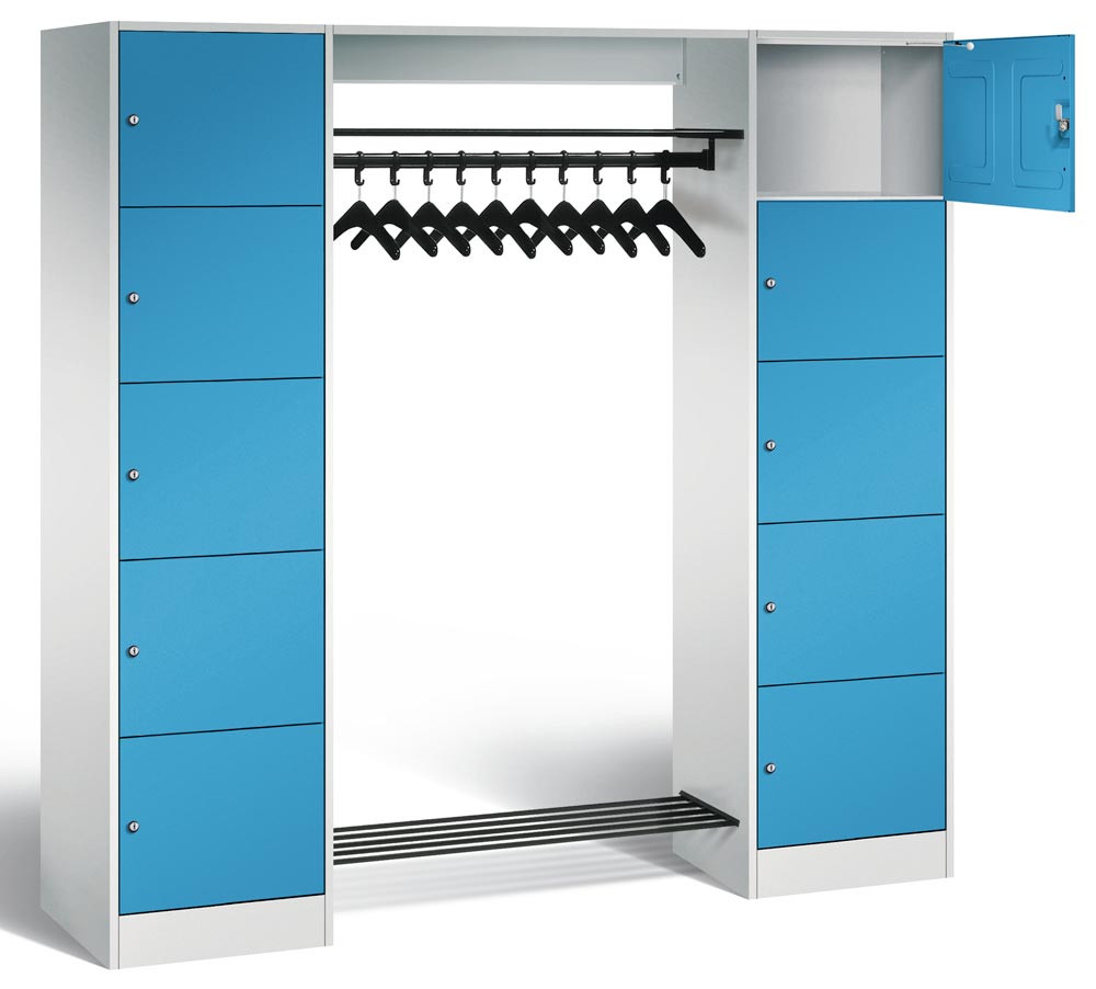 Schließfachschränke mit 5 Fächern übereinander bieten in Kombination mit funktionalen Garderobeneinheiten für 5, 10, 15 oder 20 Personen ausreichend Platz für Kleidung und persönliche Dinge.