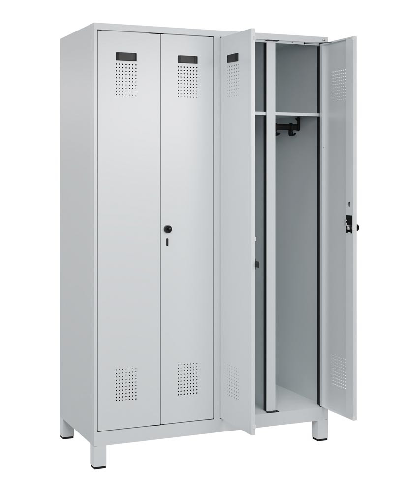 · Stabile Stahlkonstruktion mit hochwertiger Einbrennbeschichtung · Schmale Seitenkanten für verbesserte Optik bei Reihenstellung · Türen verstärkt, mit Anschlagdämpfer und Lüftungslochbild · Sicherheits-Drehriegelverschluss (serienmäßig) für Vorhangschloss (als Zubehör erhältlich) · Konstruktion aufbruchgeschützt gem. höchster Klasse C nach DIN 4547-2 · Abteilboden glatt auskehrbar · Verdrehsichere Doppel-Schiebehaken · Mit paarweise zueinanderschlagenden Türen und gemeinsamem Verschluss, 2 Abteile = 1 Person · Zur professionellen "Schwarz-/Weiß-Trennung" von Berufs- und Privatkleidung gem. Arbeitsstättenrichtlinie