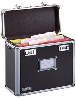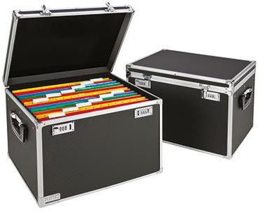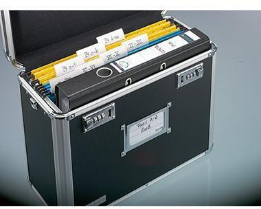 Hängeablage-Box mit Umrandungen aus Aluminium und verstärkte Ecken aus Metall. Mit doppeltem Zahlenschloss · Namensschild und Tragegriff am Deckel.