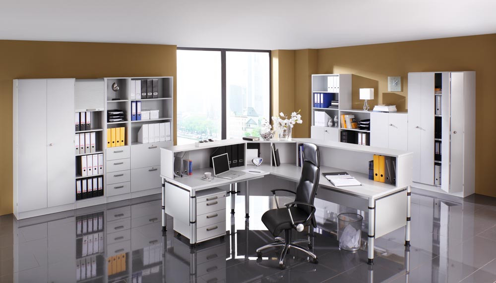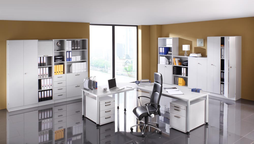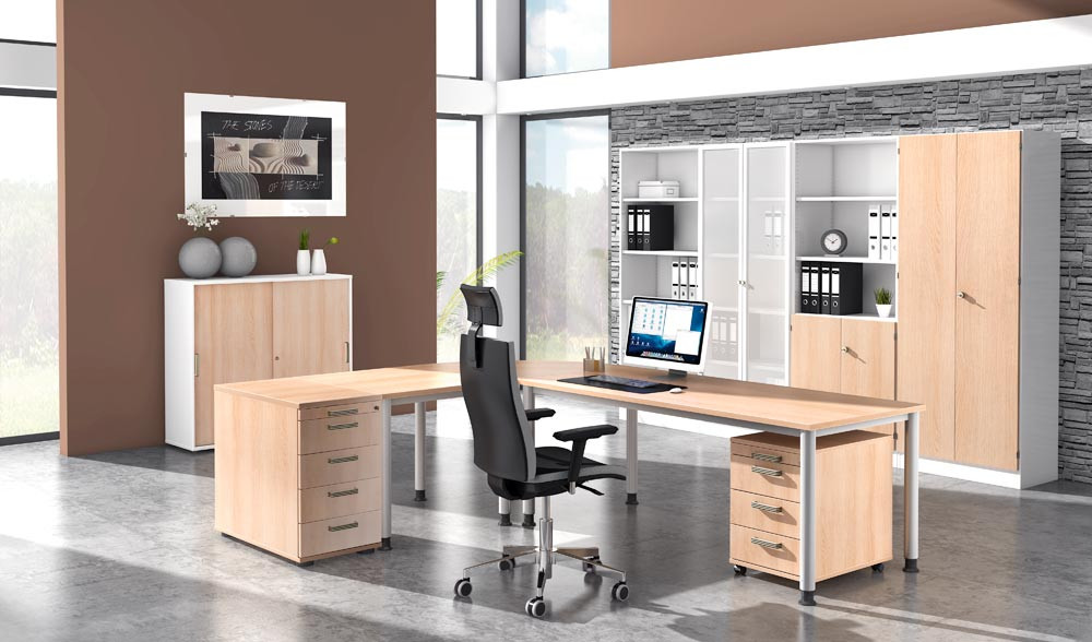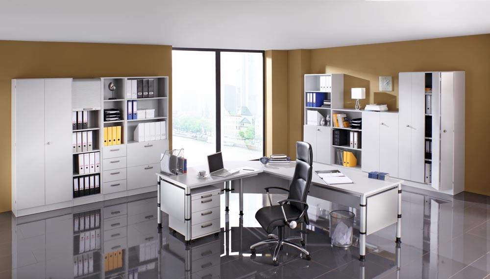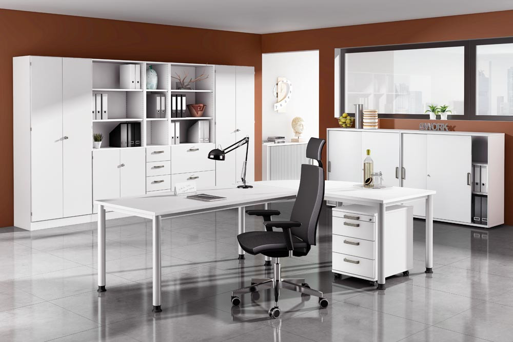 ∙ Platten 25 mm stark, beidseitig kunststoffbeschichtet, geprüft nach DIN 4554 ∙ Tischbeine aus Rundrohrstahl Ø 60 mm, höhenverstellbar , einbrennlackiert, weißaluminium ähnl. RAL 9006