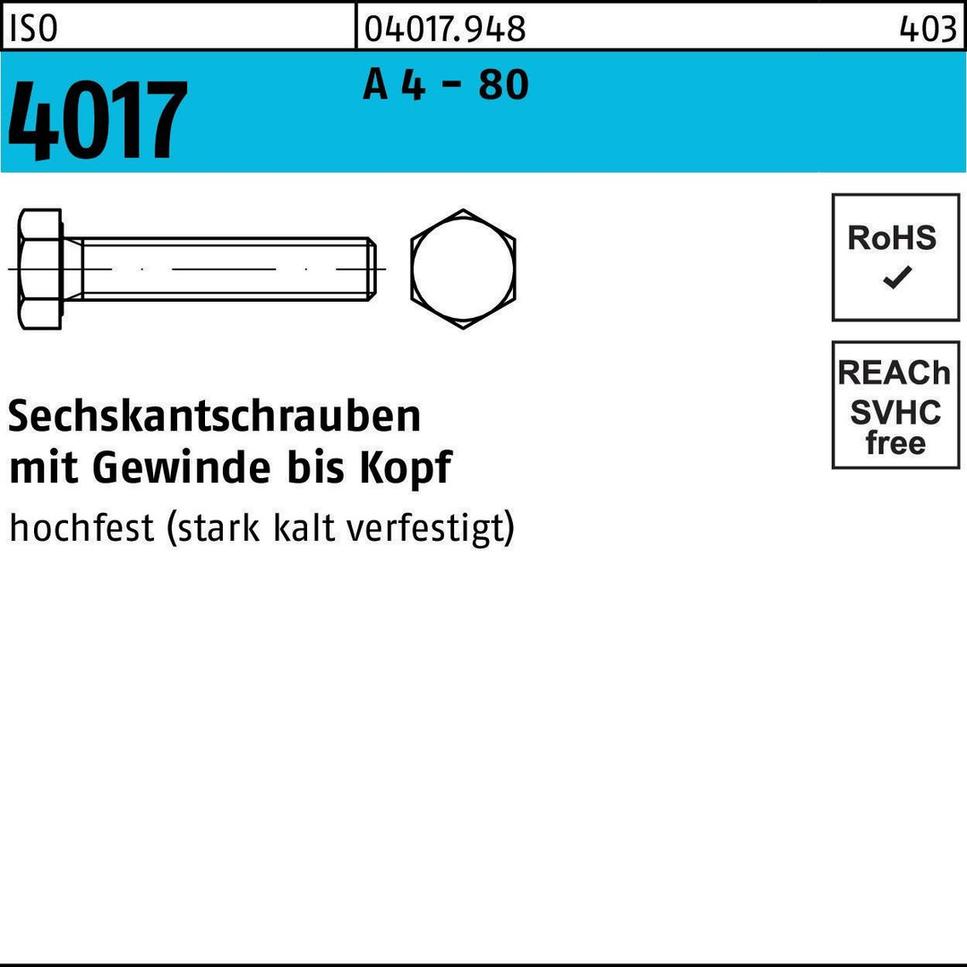 Sechskantschraube ISO 4017 VG M6x 10 A 4 - 80 100 Stück