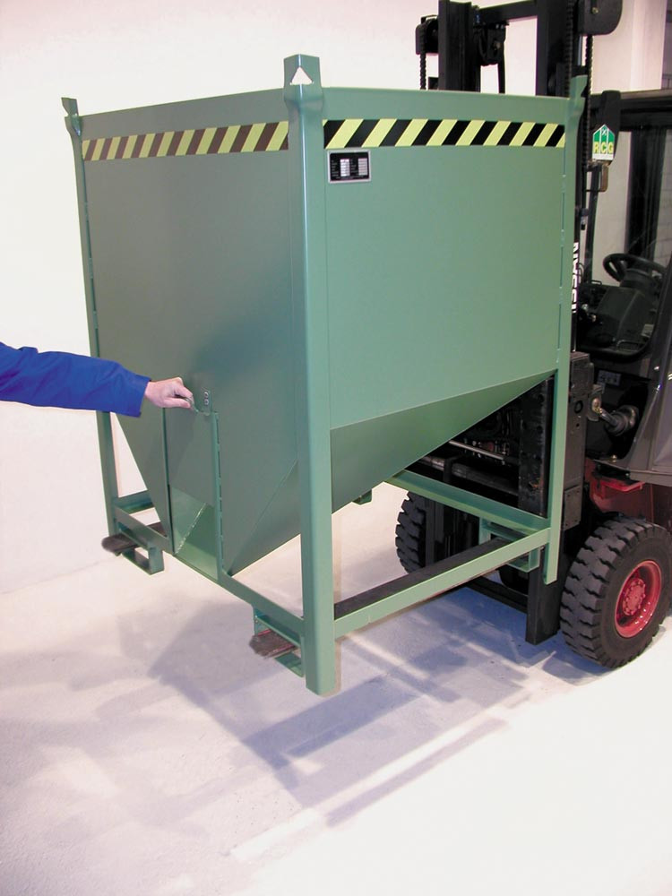 ∙ Für die getrennte Sammlung und Entleerung von Schüttgütern ∙ 3-fach stapelbar ∙ Robuste Stahlblechkonstruktion ∙ Trichter aus 2 mm Stahlblech mit umlaufender Verstärkung ∙ Bodenschräge 30° ∙ Grundrahmen mit Einfahrbügeln ∙ Aufnahmen für Gabelstapler und Kran ∙ Auch mit Gabelhubwagen transportierbar