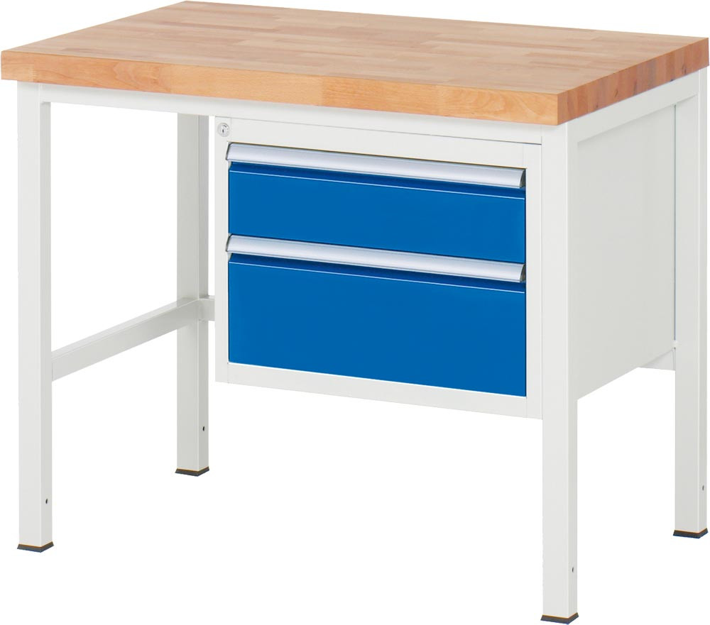 Werkbank, BxTxH 1000x700x840-1040 mm, 2 Schubladen 150/210 mm, Platte Buche 40 mm, RAL 7035/5010 E6490667