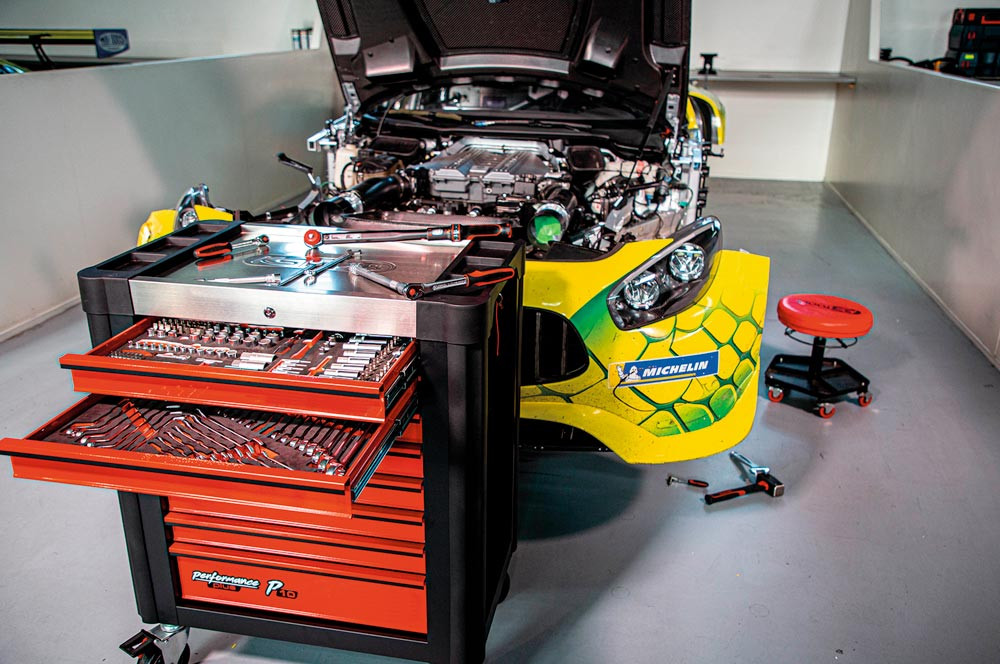 ∙ Arbeitsplatte aus Edelstahl ∙ Umrandung mit Kleinteilfächern ∙ Stabile Stahlblechkonstruktion mit 0,8 mm Blechstärke ∙ Seitenwände mit Vierkantlochung zum Anbringen verschiedener Zubehörteile ∙ Einzelverriegelung verhindert ungewolltes Öffnen · Zentralverriegelung aller Schubladen durch Zylinderschloss ∙ Kugelgelagerte Schubladenführung