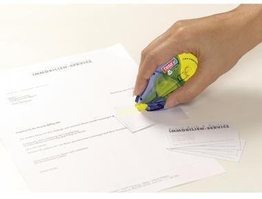 Mit dem tesa® Roller Kleben non permanent eco Logo® können Sie schnell und sauber etwas ankleben und einfach wieder ablösen. 1 Gehäuse für 3 unterschiedliche Anwendungen (korrigieren = weiß / kleben permanent = rot / kleben non permanent = gelb) · 2 Klicks genügen · um die entsprechenden Nachfüllkassetten auszutauschen · handfreundliches · ergonomisches Design. Das transparente Gehäuse macht die verbleibenden Bandmenge sichtbar · mit praktischen Rad zum Straffen des Bandes. Klebt sauber und schnell.